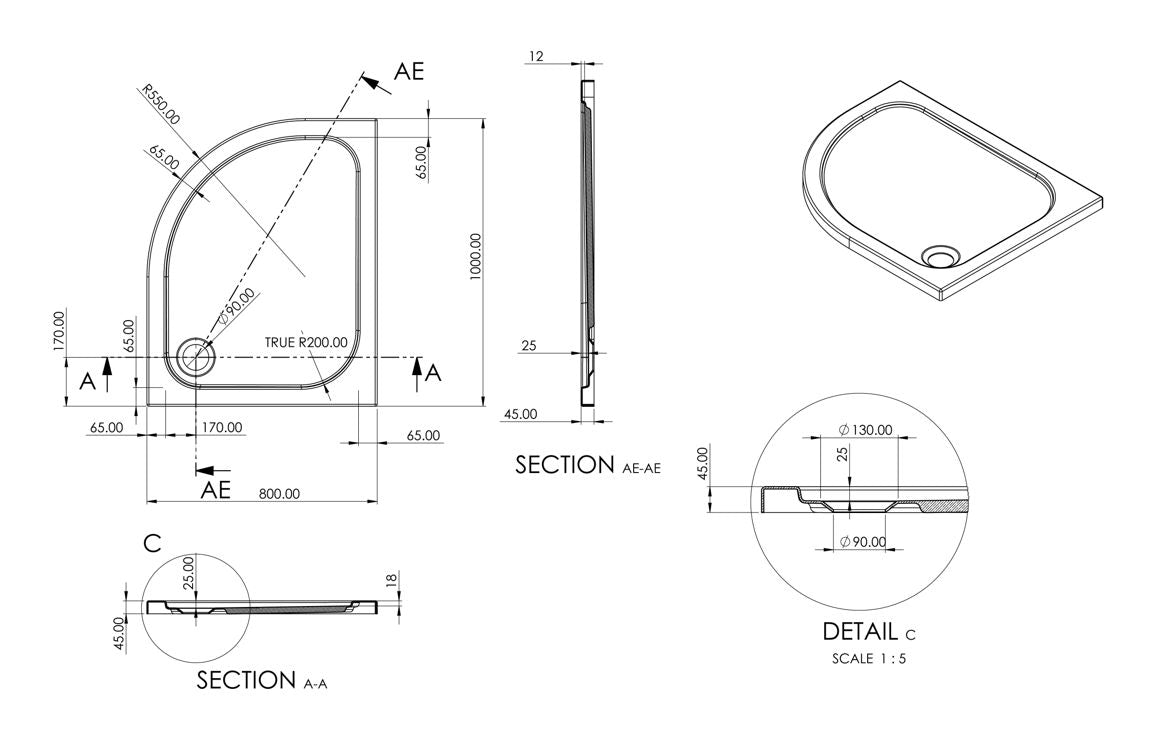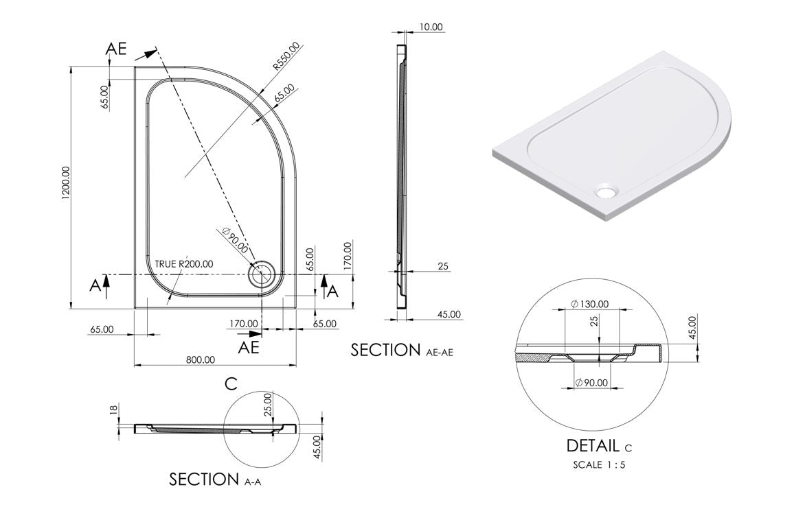 The tray is made from glass reinforced plastic (GRP) — a lightweight, strong, and durable material that is resistant to cracking and flexing, making it ideal for low profile shower trays.