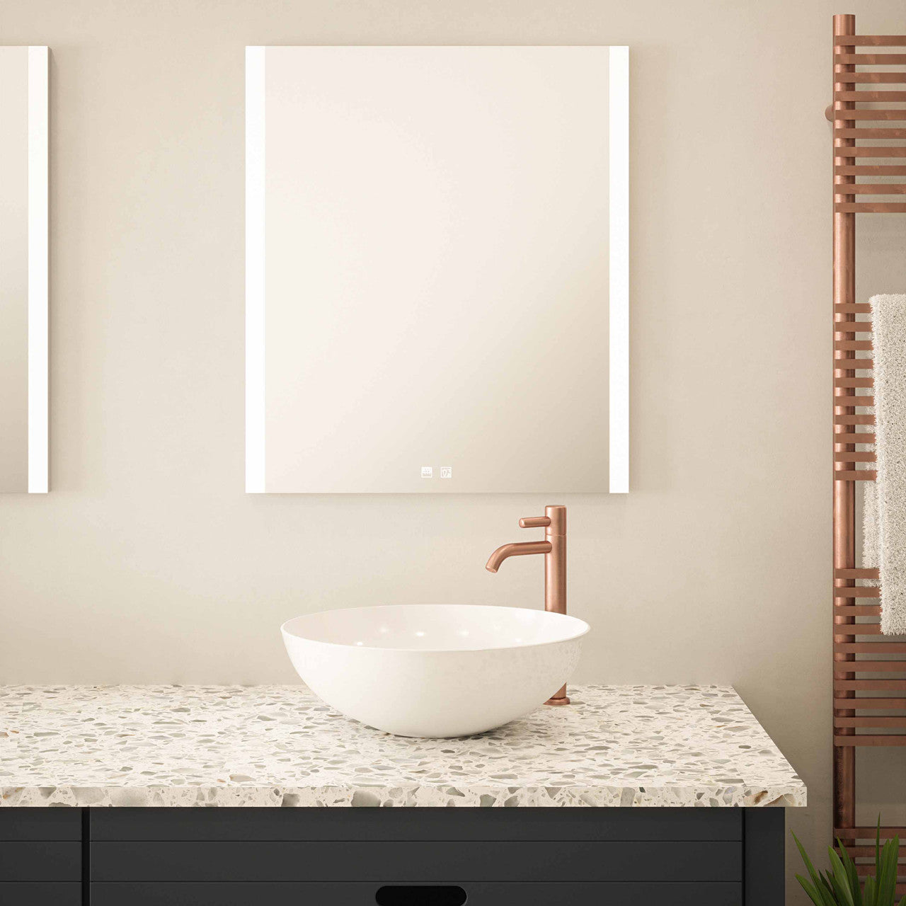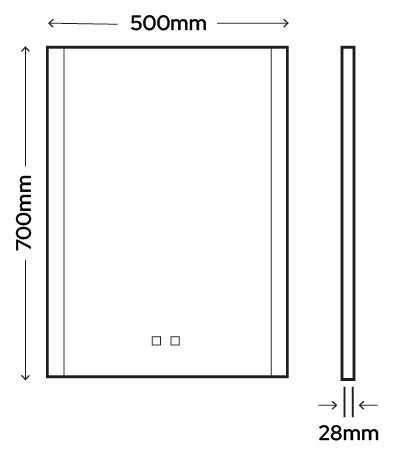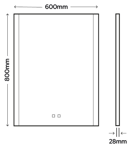 Portrait orientation mirror available in two sizes: 600×800mm (8kg) or 500×700mm (5.5kg). Requires 240V electrical connection - professional installation by qualified electrician recommended. IP44 rating suitable for bathroom zones 2 and 3. Wall-mounted installation on solid wall construction. 300mm cable length. Ensure wall can support mirror weight.