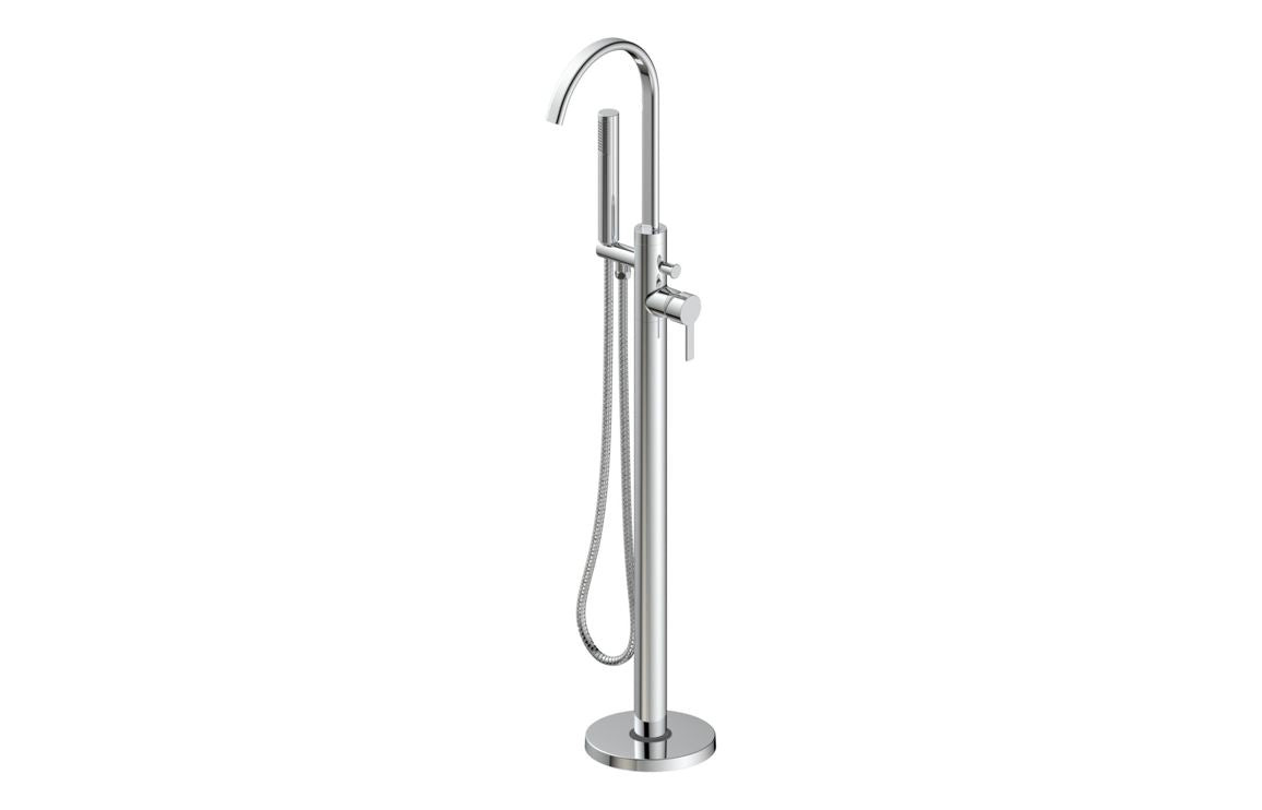 A floor standing bath shower mixer is a freestanding tap unit that connects to the hot and cold water supply through the floor rather than through the bath deck or wall. It rises vertically from the floor alongside the bath, with a spout for filling and a diverter to switch to an overhead or handheld shower. No tap holes in the bath are required.